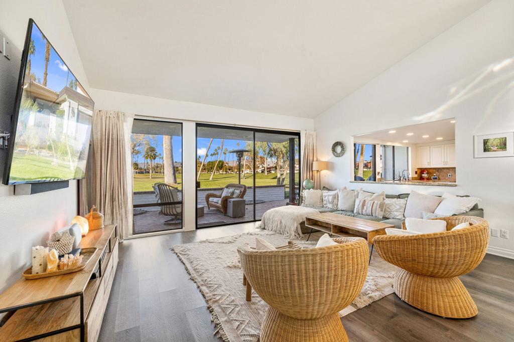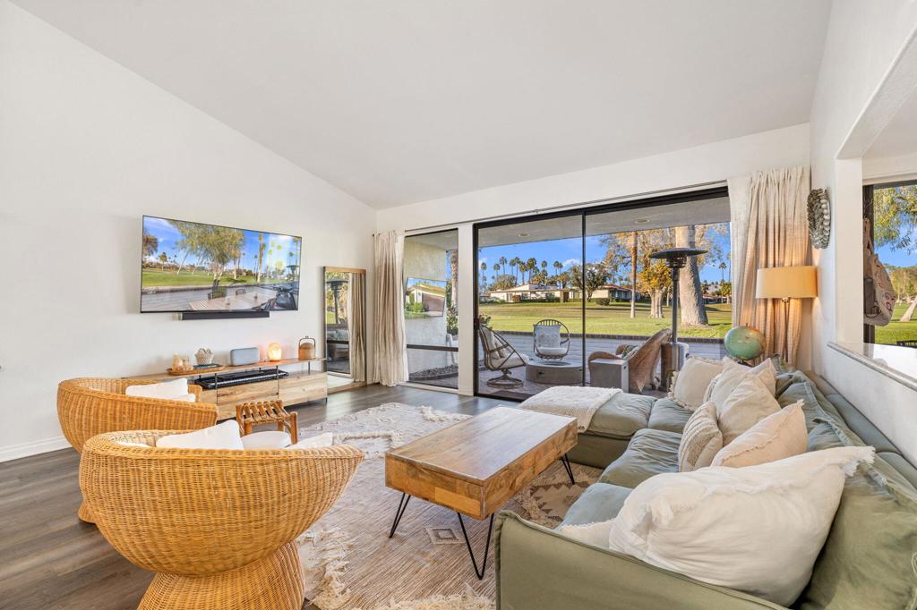 This light and bright condo has 3 bedrooms, 2 bathrooms with dramatic ceilings, clerestory windows and a large gathering area. Consistent flooring throughout elevates the entire space. The gas range and other stainless-steel appliances paired with the classic white cabinets & stone backsplash keep this updated kitchen timeless. The converted atrium enhances the third bedroom, creating a wonderful flex space with a murphy bed that tucks away easily when not in use. The secondary bedroom has direct access to the private bathroom for maximum comfort. Plantation shutters in the bedrooms provide privacy. Both front and rear patios have a modern take on a classic brick, arranged in a striking chevron format. Beautiful mountain views surround the property while the lush fairways provide a lovely scenic view. The garage has built-in storage cabinets, an attic and epoxy floor. The community pool is just a few houses away. Located in the desired Rancho Las Palmas Country Club. An ideal location being an easy walk to the River just outside the front gate of Rancho Las Palmas. Walk to shopping, dinner or a movie. Or enjoy a spa day at the Rancho Las Palmas Resort & Spa, grab a coffee or dine at the new Double Date restaurant, all just a short walk or golf cart drive from your front door. Owners receive discounts at the resort, spa, clubhouse, dining and for golf.